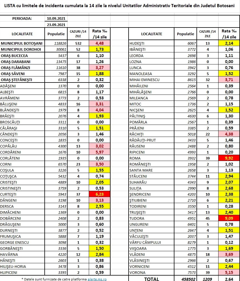 În zonă roșie sunt localitățile Botoșani-4,48 la mie, Flămânzi-3,27, Bălușeni-3,31, Blândești-4,04, Copălău-3,02, Cordăreni-5,97, Corni-3,50, Curtești-6,23, Dângeni-3,13, Mihai Eminescu-3,71, Răchiți-4,38, Roma-9,92, Tudora-9,09, Vlădeni-3,69 și Votona-5,15. Rata de infectare la nivelul județului Botoșani este de 2,64 la mia de locuitori.