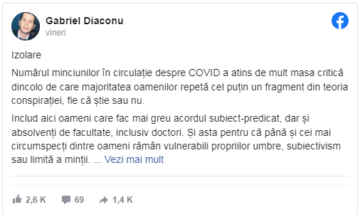 „Numărul minciunilor în circulație despre COVID a atins de mult masa critică dincolo de care majoritatea oamenilor repetă cel puțin un fragment din teoria conspirației, fie că știe sau nu.