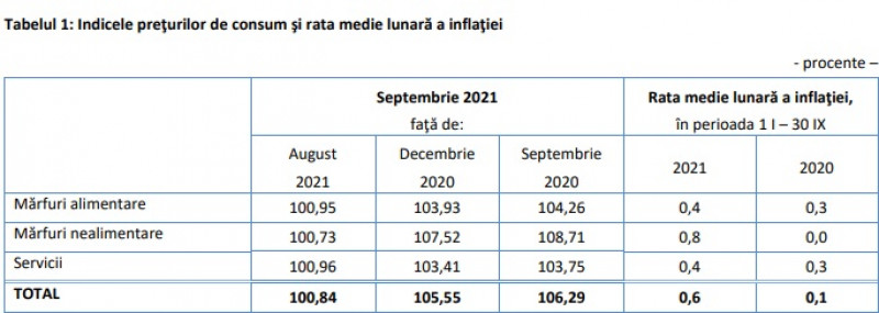 Rata inflaţiei de la începutul anului (septembrie 2021 comparativ cu decembrie 2020) este 5,6%, în timp ce rata anuală a inflaţiei în luna septembrie 2021 comparativ cu luna septembrie 2020 a ajuns la 6,3%.