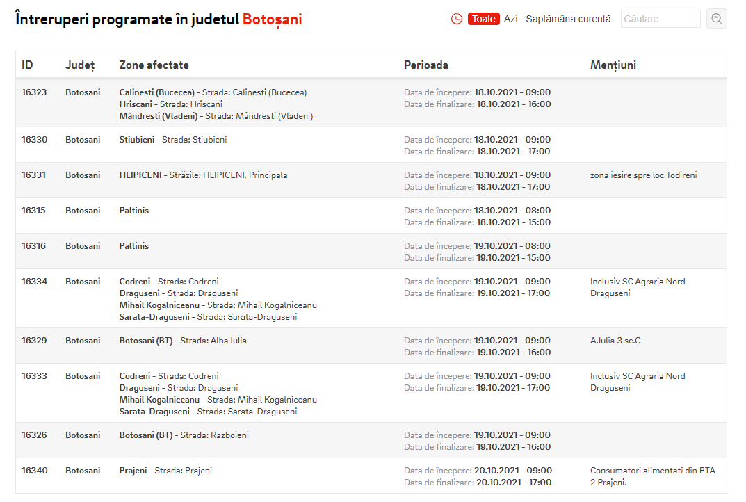Curentul va fi sistat, pe parcursul săptămânii viitoare, în mai multe localități din județul Botoșani, ca urmare a unor lucrări la rețelele electrice desfășurate de societatea comercială Delgaz Grid. Astfel, populația din localitățile afectate de lucrări va rămâne fără energie electrică în intervalele orare 8.00- 16.00 sau 9.00-17.00.