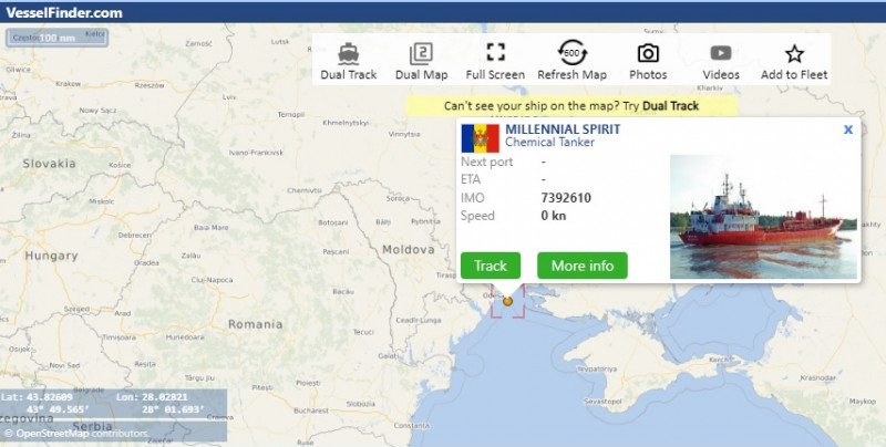 „Agenția Navală a Republicii Moldova informează că la data de 25.02.2022, nava MILLENIAL SPIRIT IMO Nr. 7392610 (nava de tip Chemical Tanker) sub pavilionul Republicii Moldova fiind în apele neutre din Marea Neagră (46°22.221’N, 031°07.095’E) a fost lovit de un obuz (nu se cunoaște sursa lansării obuzului). La bordul navei a izbucnit un incendiu, echipamentele și bărcile de salvare au fost distruse, echipajul navei a părăsit nava echipați doar cu veste de salvare. La moment petrec acțiuni de salvare de către navele din preajmă. Echipajul navei sunt cetățeni ai Federației Ruse. Operatorul navei este persoană juridică din Ucraina. Agenția Navală va informa adăugător privind procesul de salvare a echipajului și navei sub pavilionul Republicii Moldova”, se arată într-un comunicat de presă.