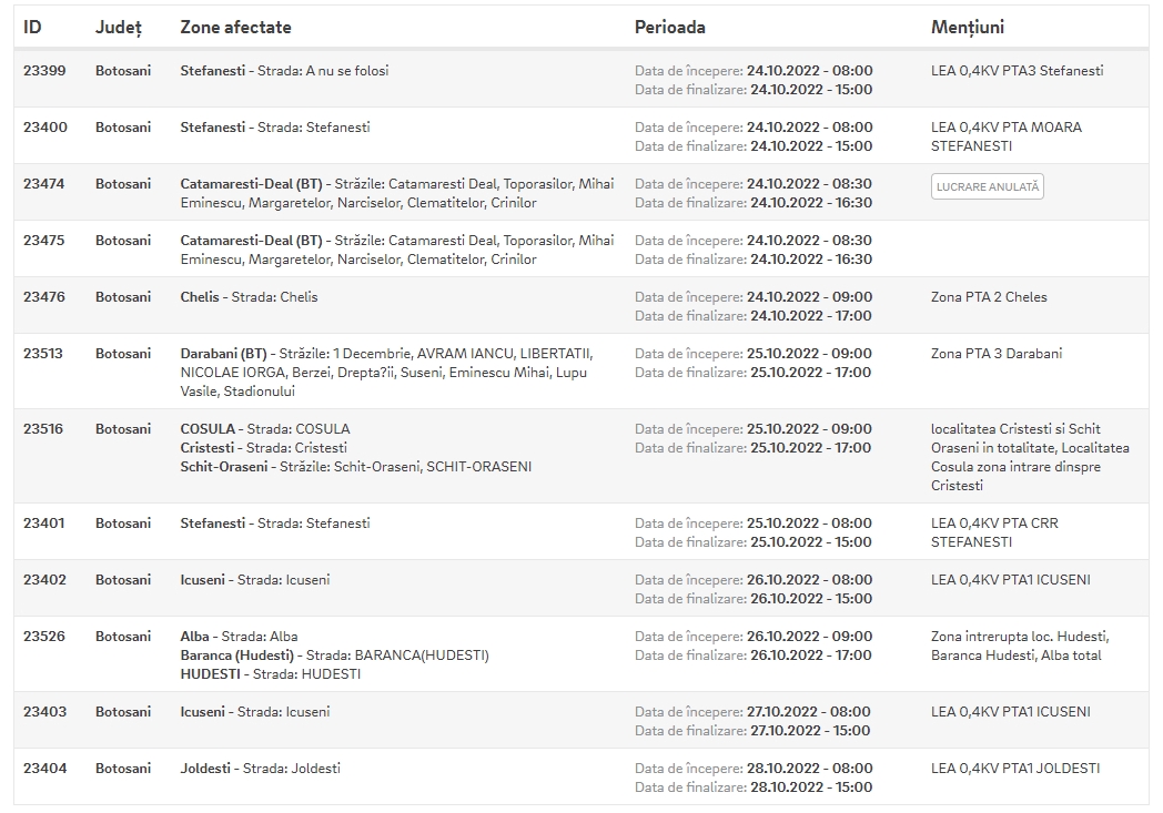 Energia electrică va fi întreruptă, în această săptămână, în mai multe localități din județul Botoșani, ca urmare a intervențiilor echipelor de electricieni de la Delgaz Grid SA pentru mentenanța rețelelor. Astfel, de astăzi până vineri, vor fi sistări ale curentului în localitățile Darabani, Ștefănești, Cătămărăști Deal, Cheliș, Coșula, Cristești, Schit Orășeni, Hudești, Alba, Joldești, Icușeni sau Baranca.