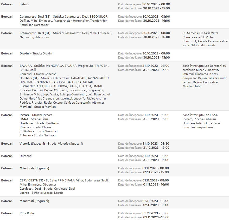 Societatea comercială Delgaz Grid SA a anunțat că va întrerupe, în această săptămână, furnizarea energiei electrice către mai multe localități din județul Botoșani, pe fondul lucrărilor de mentenanță a rețelelor electrice. Vor fi afectate și zone din municipiul Botoșani, orașul Darabani, dar și alte câteva localități. Iată graficul de intervenție: