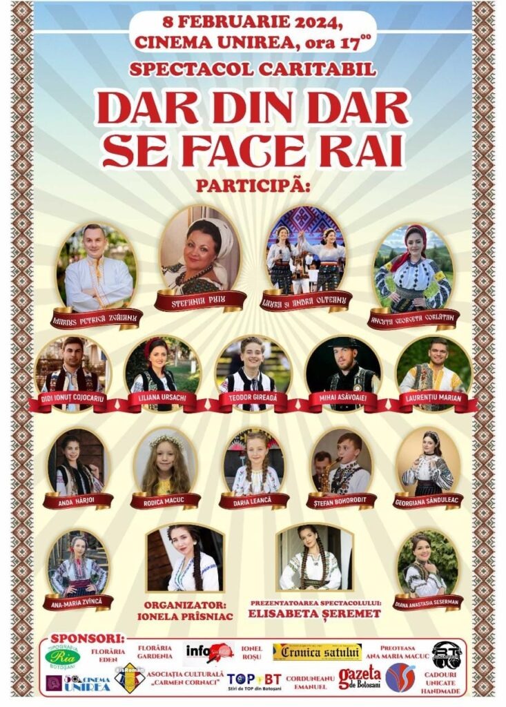 Spectacolul promite să aducă bucurie și speranță în inimile participanților, oferind ocazia de a participa la o cauză nobilă. Așadar, pentru a aduna suma necesară, facem apel la bunătatea dumneavoastră și vă invităm joi, 8 februarie, ora 17:00, la un spectacol folcloric susținut de artiști cu suflet mare pe scena de la Cinema Unirea din Botoșani. Încasările din donațiile primite vor fi direcționate pe bază de proces verbal familiei Andriesei Ioan și Lăcrămioara pentru construirea casei acestora. BILETELE le puteți rezerva de la organizatoarea spectacolului, Ionela Prîsniac, și pentru asta o puteți contacta pe Facebook sau pe WhatsApp la 0758903881 sau le puteți achiziționa atunci când veniți la spectacol, însă în limita locurilor rămase disponibile, de aceea vă recomandăm să le rezervați din timp!