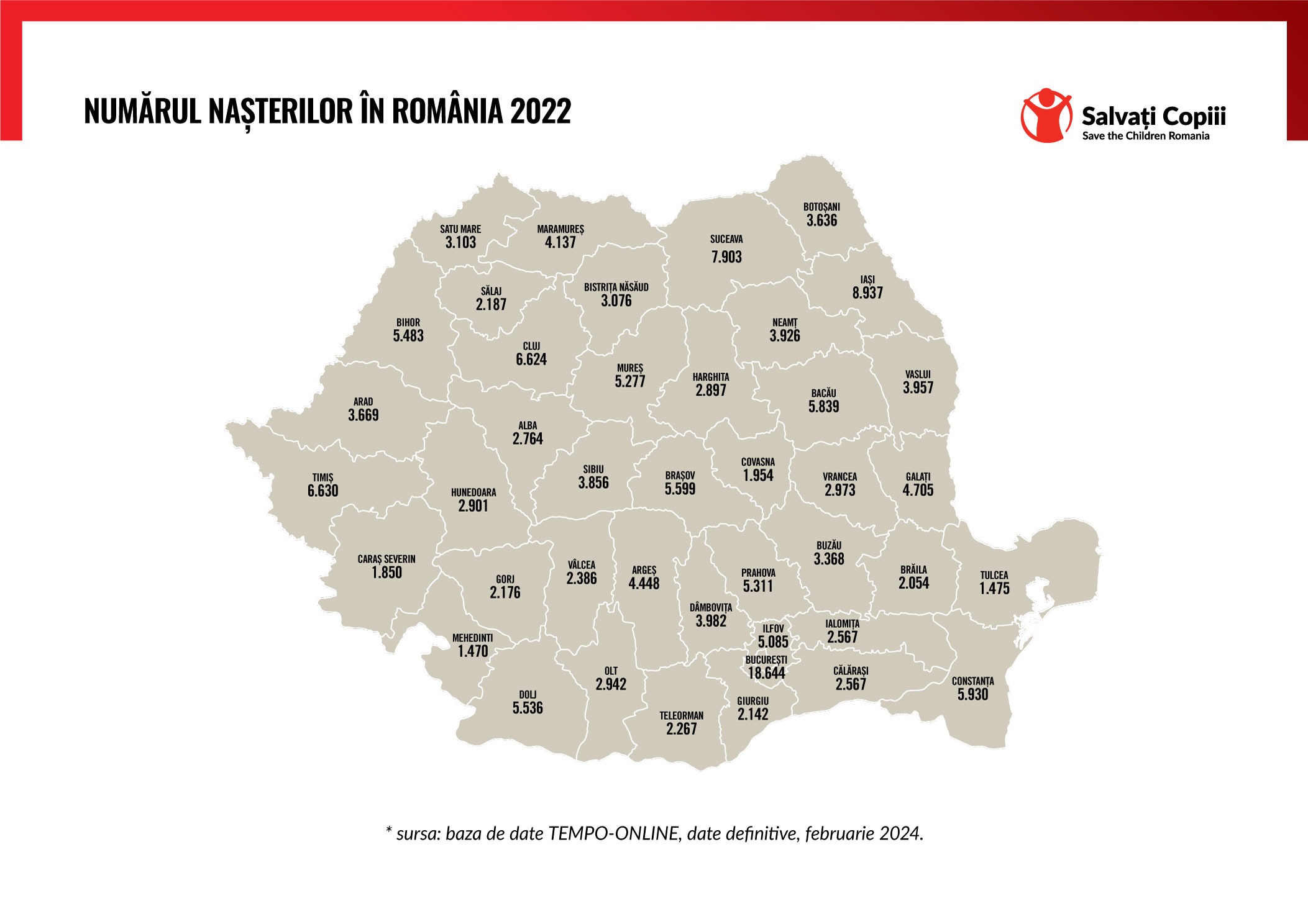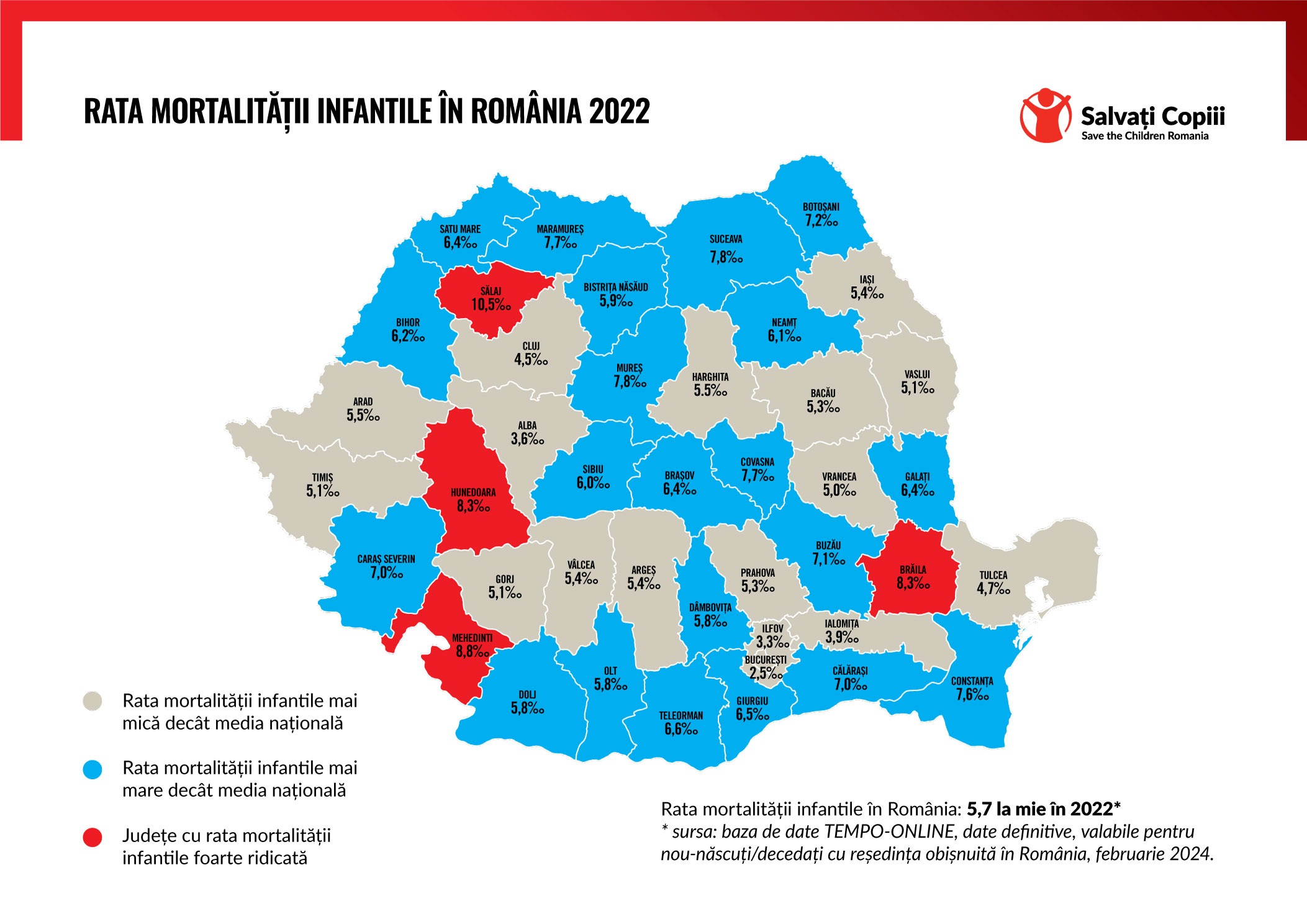 Doar în 2023, Salvați Copiii a dotat peste 55 de unități medicale cu echipamente performante, asigurând supraviețuirea și tratamentul adecvat pentru cel puțin 40.000 de copii. Harta mortalității infantile: Potrivit datelor finale ale INS, în anul 2022, rata mortalității infantile conservă discrepanțele majore dintre județele țării. La Botoșani, rata mortalității infantile este de 7,2%.