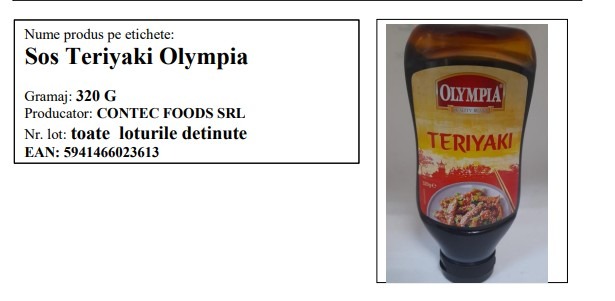 Două produse au fost retrase de la comercializare de Carrefour. Primul este Sos Teriyaki Olympia, de 320 g, produs de Contec Foods SRL, unde a fost identificată prezenta unui alergen in ingrediente (glutenul din sosul de soia ), care nu este mentionat pe eticheta.