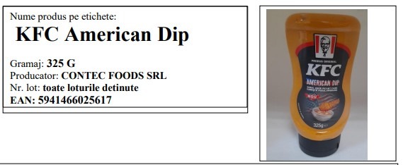 Al doilea produs este KFC American Dip, de 325 grame, produs tot de Contec Foods SRL. Și aici a fost identificată prezenta unui alergen in ingrediente (glutenul din sosul de soia ), care nu este mentionat pe eticheta. Cei care l-au cumpărat pot primi banii înapoi în baza bonului fiscal.