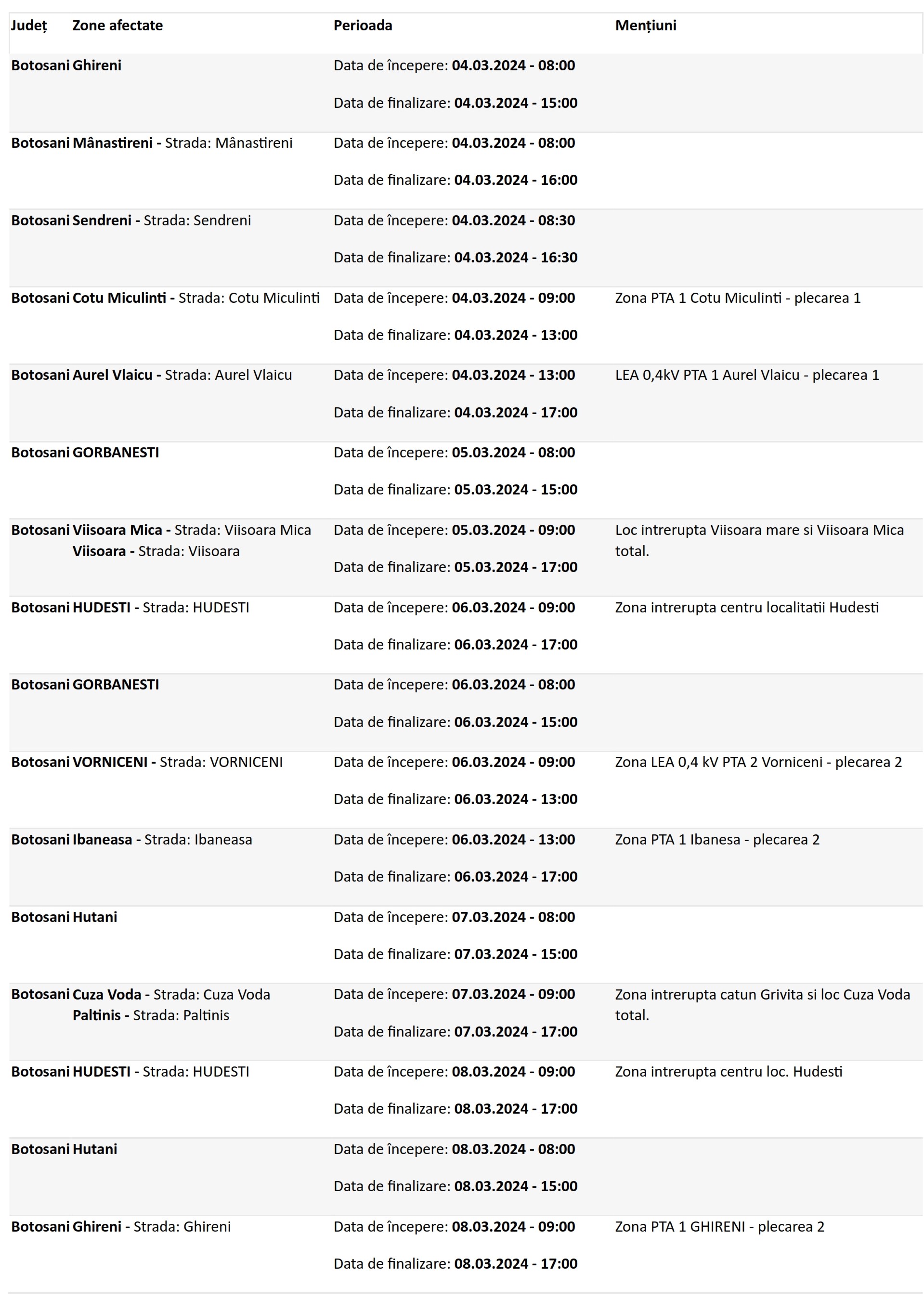 Compania Delgaz Grid SA, furnizorul de energie electrică din județul Botoșani, a anunțat că în această săptămână va fi necesară întreruperea serviciilor de electricitate în mai multe localități din cauza unor lucrări de întreținere la rețelele electrice.
