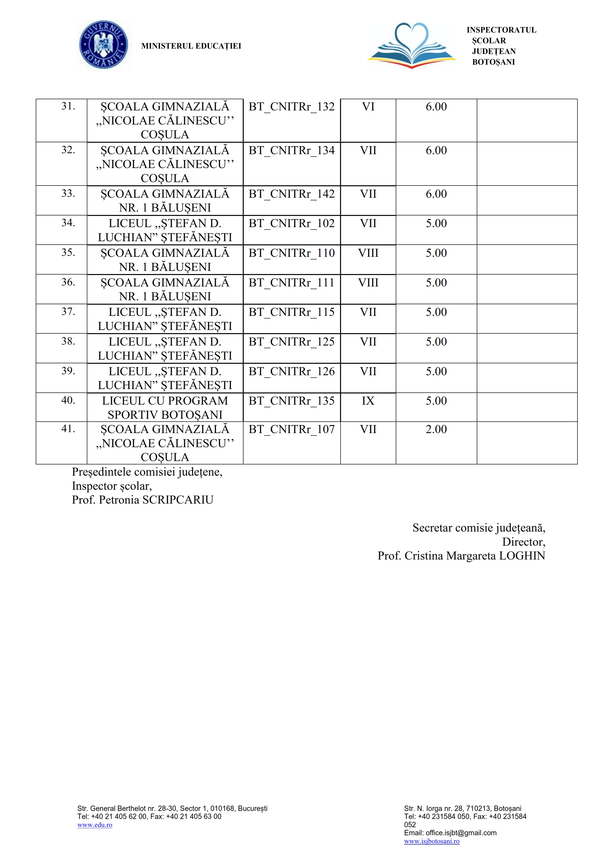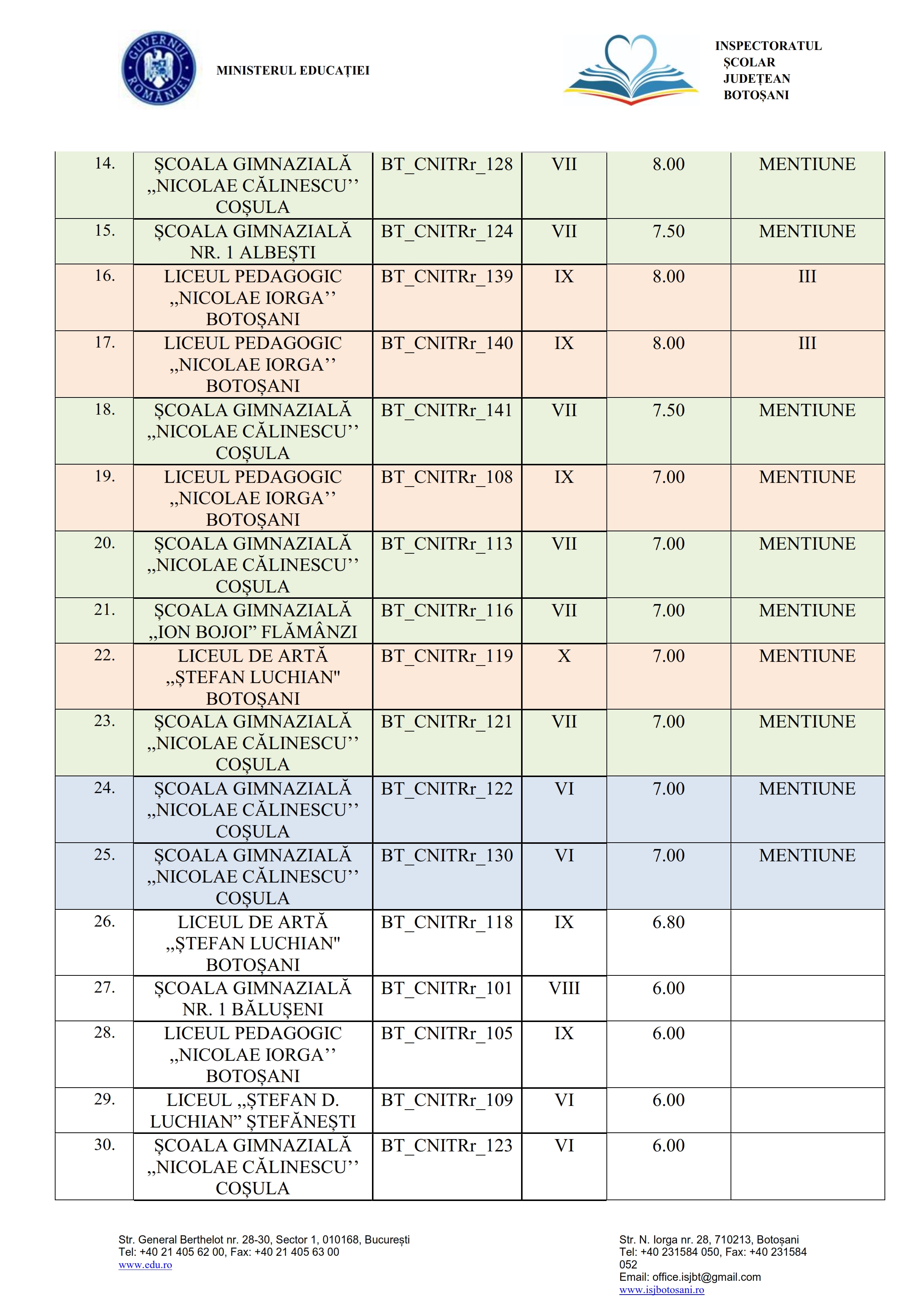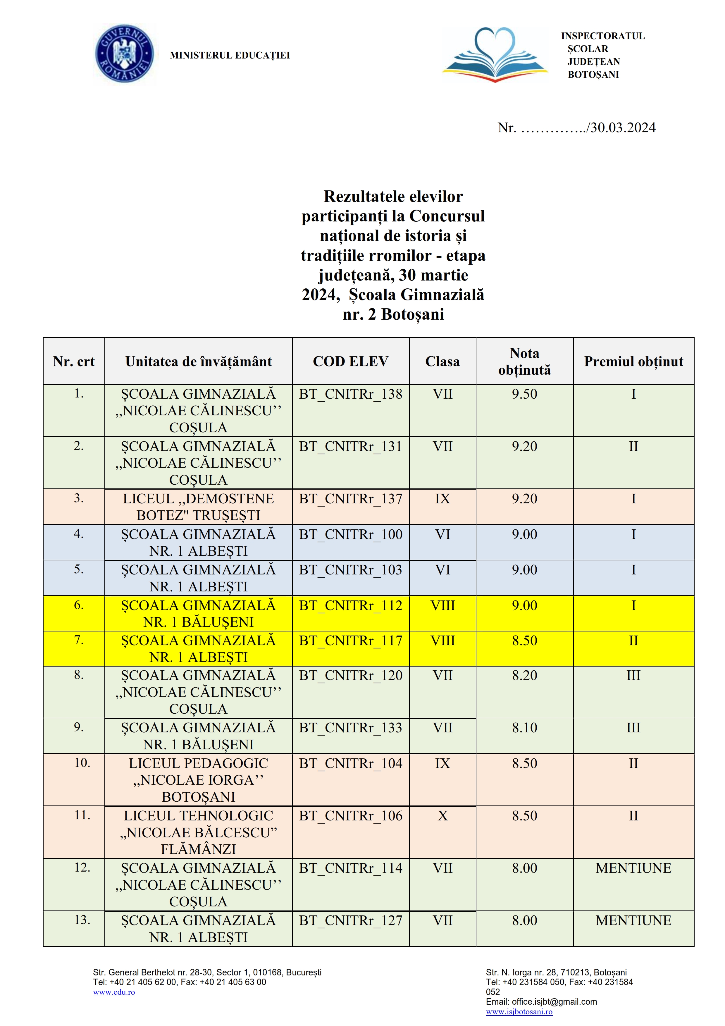Elevii botoșăneni au participat la Concursul Național de Istoria și Tradițiile Romilor. Etapa județeană a avut loc pe 30 martie la Școala Gimnazială nr. 2 Botoșani. Cea mai mare notă a fost 9.50 și a fost obținută de un elev al Școlii Gimnaziale „Nicolae Călinescu” din Coșula, din clasa a VII-a.