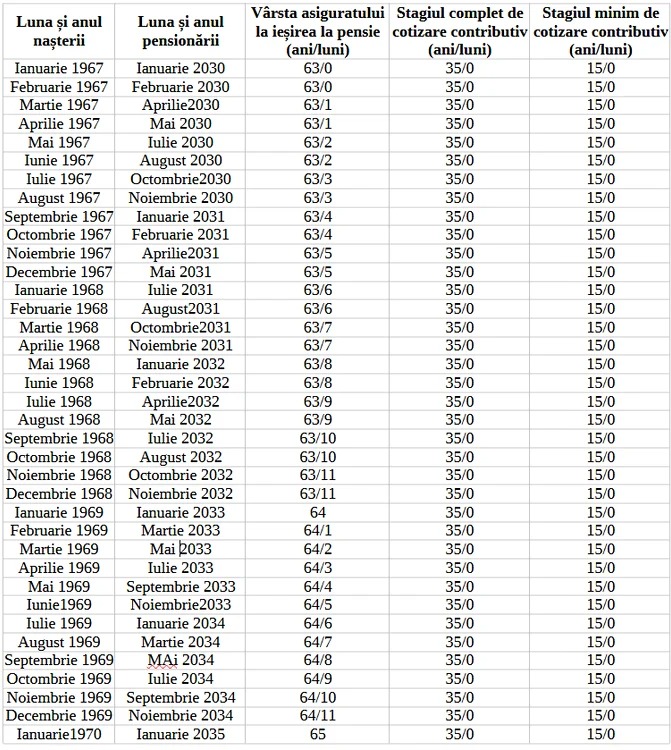 Concret, începând cu luna ianuarie 2035, când vârsta de pensionare a femeilor va fi egală cu cea a bărbaților - 65 de ani - vârsta de pensionare va fi corelată cu speranța de viață. Conform art. 47 din Legea 360/2023, vârsta standard de pensionare la femei este de 65 de ani. În ceea ce privește stagiul de cotizare contributiv, minimul este de 15 ani, iar stagiul complet este de 35 de ani.