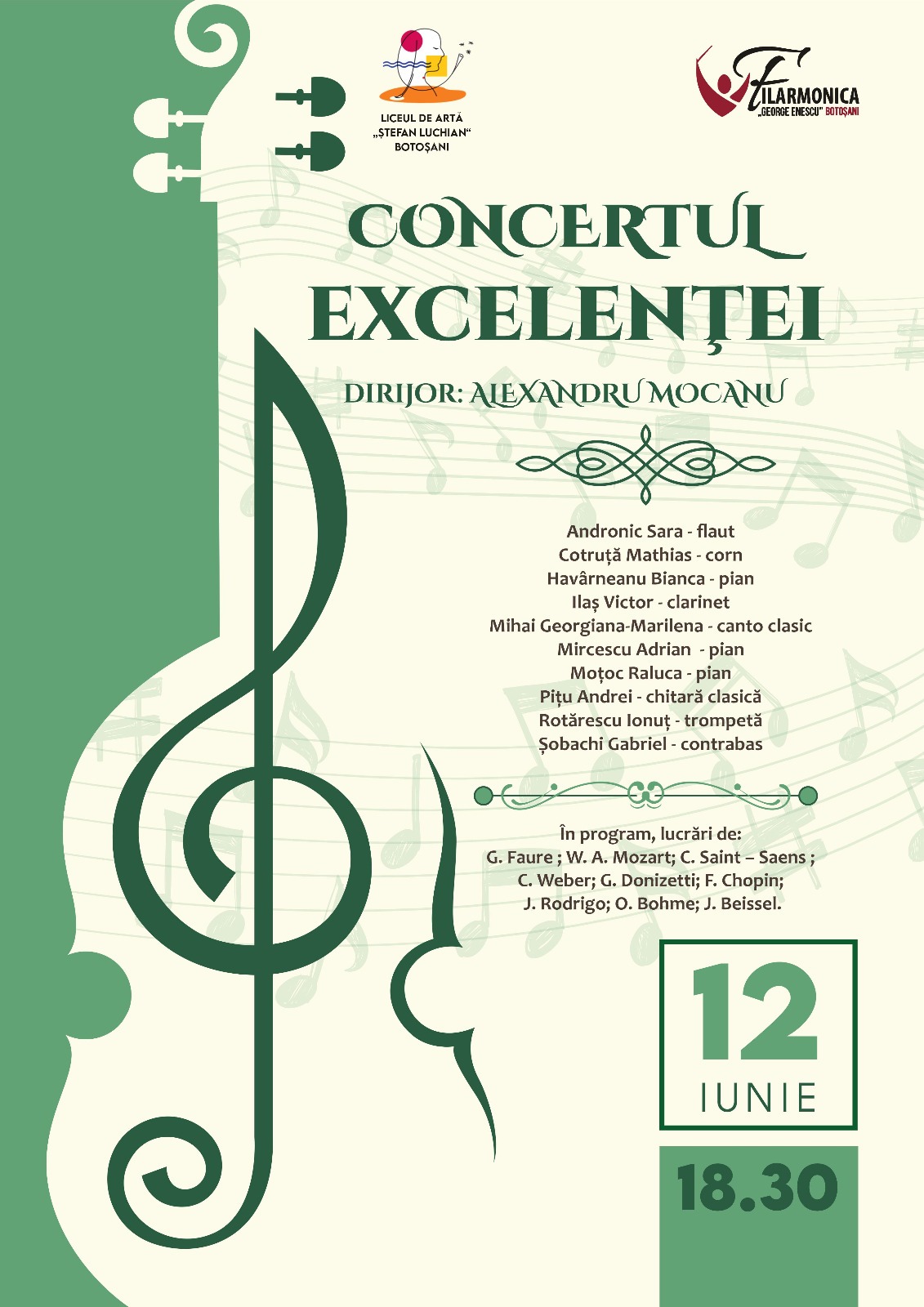Fiindcă muzica este cel mai desăvârșit translator al vibrației sufletului omenesc, Liceul de Artă „Ștefan Luchian” din Botoșani și Filarmonica „George Enescu” Botoșani organizează Concertul Excelenței, care va avea loc miercuri, 12 iunie 2024, ora 18:30, la Casa de Cultură a Sindicatelor.