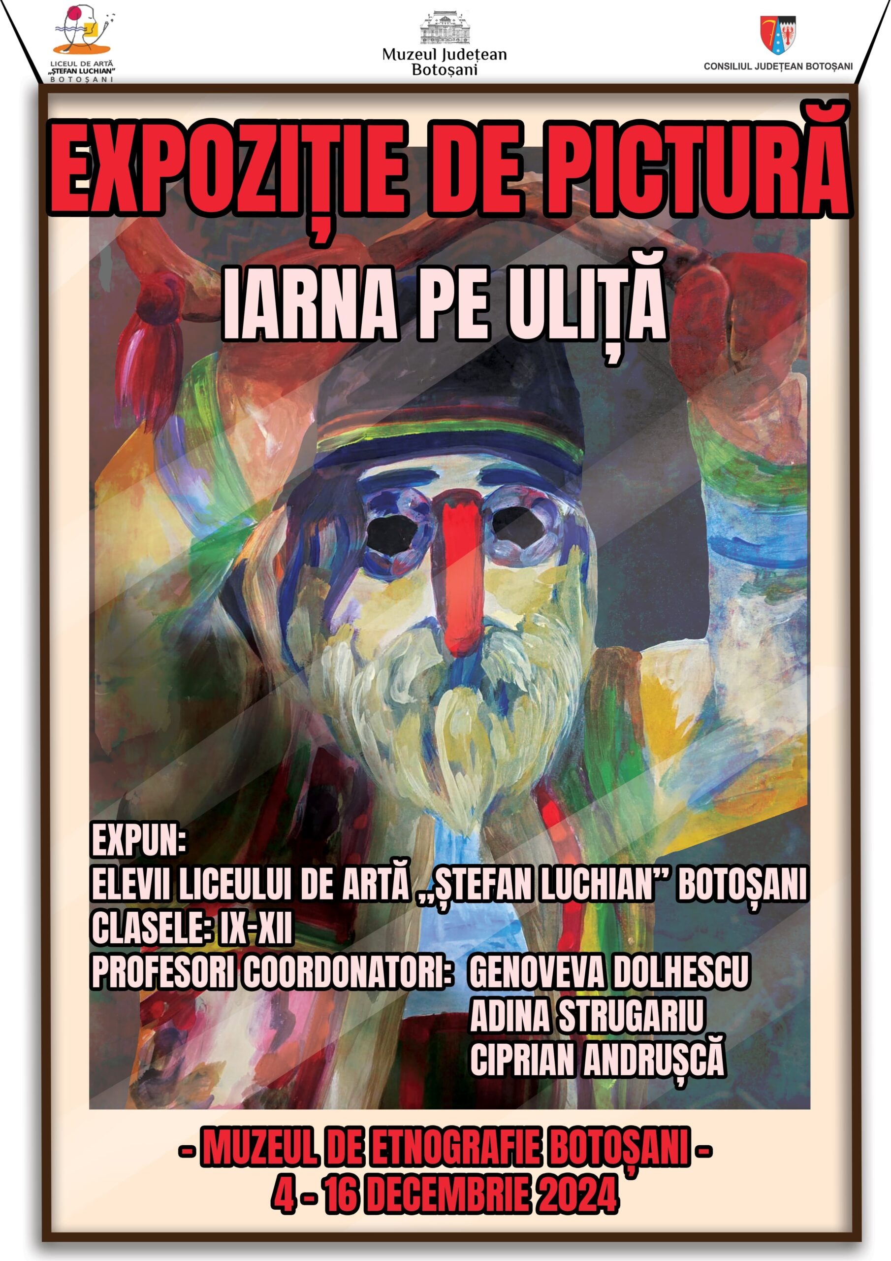 În perioada 4-16 decembrie 2024, Muzeul de Etnografie din Botoșani invită publicul la o incursiune artistică în lumea obiceiurilor și tradițiilor de iarnă, prin intermediul expoziției de pictură „Iarna pe uliță”.