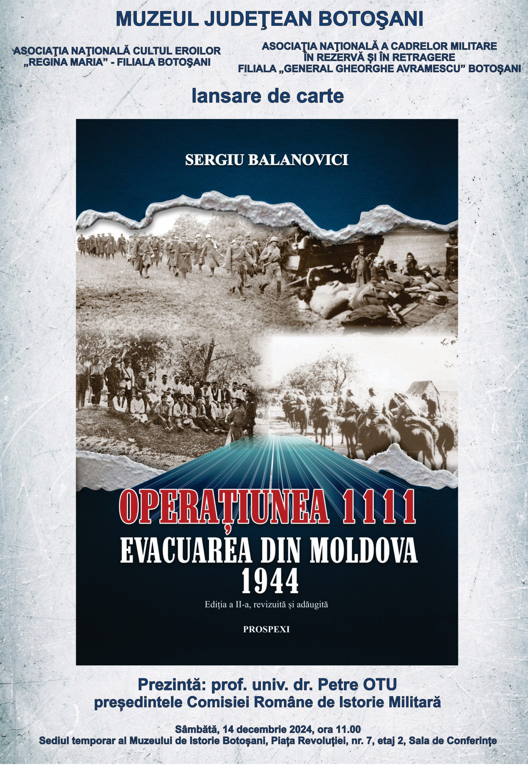 Muzeul Județean Botoșani organizează sâmbătă, 14 decembrie 2024, la ora 11:00, lansarea celei de-a doua ediții, revizuită și adăugită, a cărții „Operațiunea 1111. Evacuarea din Moldova – 1944”, scrisă de Sergiu Balanovici. Evenimentul va avea loc în sala de conferințe a sediului temporar al Muzeului de Istorie Botoșani, situat în Piața Revoluției, nr. 7, etaj 2 (clădirea CEC).