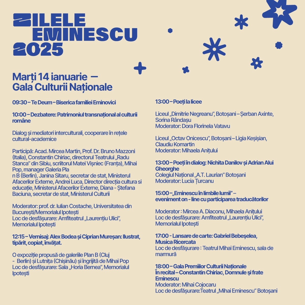 Evenimentul central al Zilelor Eminescu – Ziua Culturii Naționale îl va reprezenta Gala Culturii Naționale. La decizia unui juriu național, cu susținerea Consiliului Județean Botoșani și a mediului privat, vor fi acordate: Premiul național pentru excelență în cultură, Premiul național pentru promovarea operei eminesciene și a culturii române, Premiul național pentru traducere din literatura română și dezvoltarea studiilor românești din mediul internațional. Evenimentul, care se va încheia cu un recital susținut de Constantin Chiriac, va avea loc la Teatrul „Mihai Eminescu" în data de 14 ianuarie, începând cu ora 18:00.