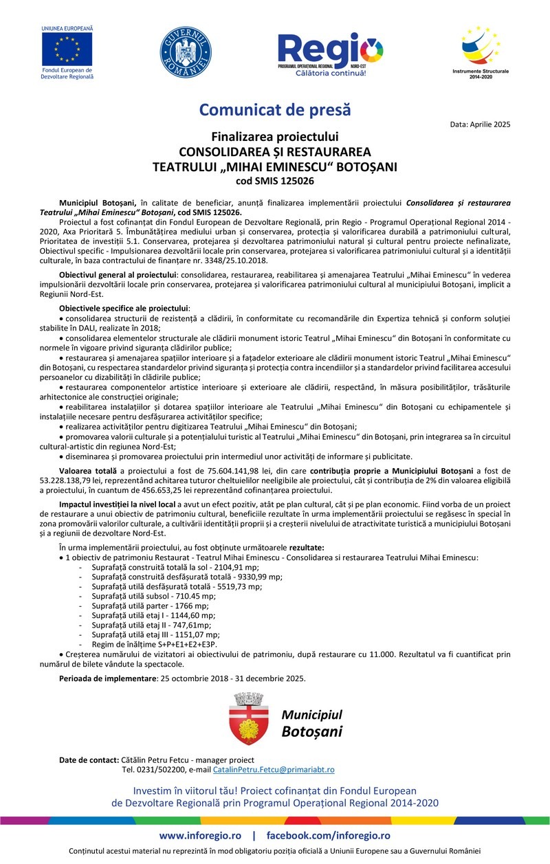 Municipiul Botoșani a anunțat finalizarea lucrărilor de consolidare și restaurare a Teatrului „Mihai Eminescu”, unul dintre cele mai importante obiective culturale din regiunea de Nord-Est. Proiectul, în valoare totală de 75.604.141,98 lei, a fost cofinanțat din Fondul European de Dezvoltare Regională, prin Regio - Programul Operațional Regional 2014-2020, Axa Prioritară 5 - Îmbunătățirea mediului urban și conservarea patrimoniului cultural.