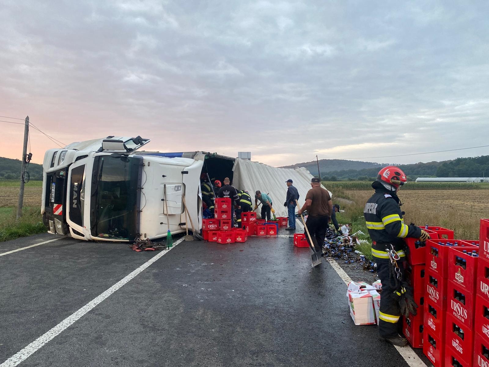 Un accident rutier spectaculos s-a produs în noaptea de marți spre miercuri, pe drumul european E 58, în localitatea Copălău, județul Botoșani. Un tir încărcat cu 24 de tone de bere s-a răsturnat pe carosabil, blocând circulația rutieră în zonă.