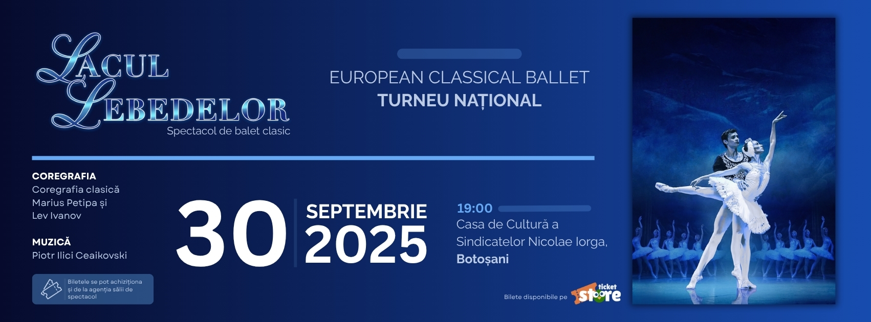 Publicul botoșănean va avea parte de o seară de neuitat, marți, 30 septembrie 2025, de la ora 19:00, la Casa de Cultură a Sindicatelor „Nicolae Iorga”, unde compania European Classical Ballet va prezenta capodopera „Lacul Lebedelor” de Piotr Ilici Ceaikovski.