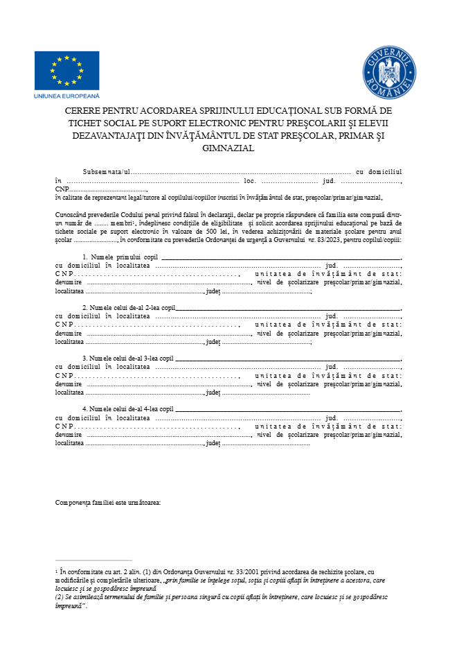 Preșcolarii și elevii din familii defavorizate, înscriși în unitățile de stat de învățământ primar și gimnazial, vor beneficia și în anul școlar 2025-2026 de carduri educaționale în valoare de 500 de lei, potrivit OUG nr. 83/2023. Sprijinul financiar se acordă o singură dată, într-o tranșă unică, și poate fi folosit exclusiv pentru achiziționarea de rechizite și articole vestimentare necesare școlii.
