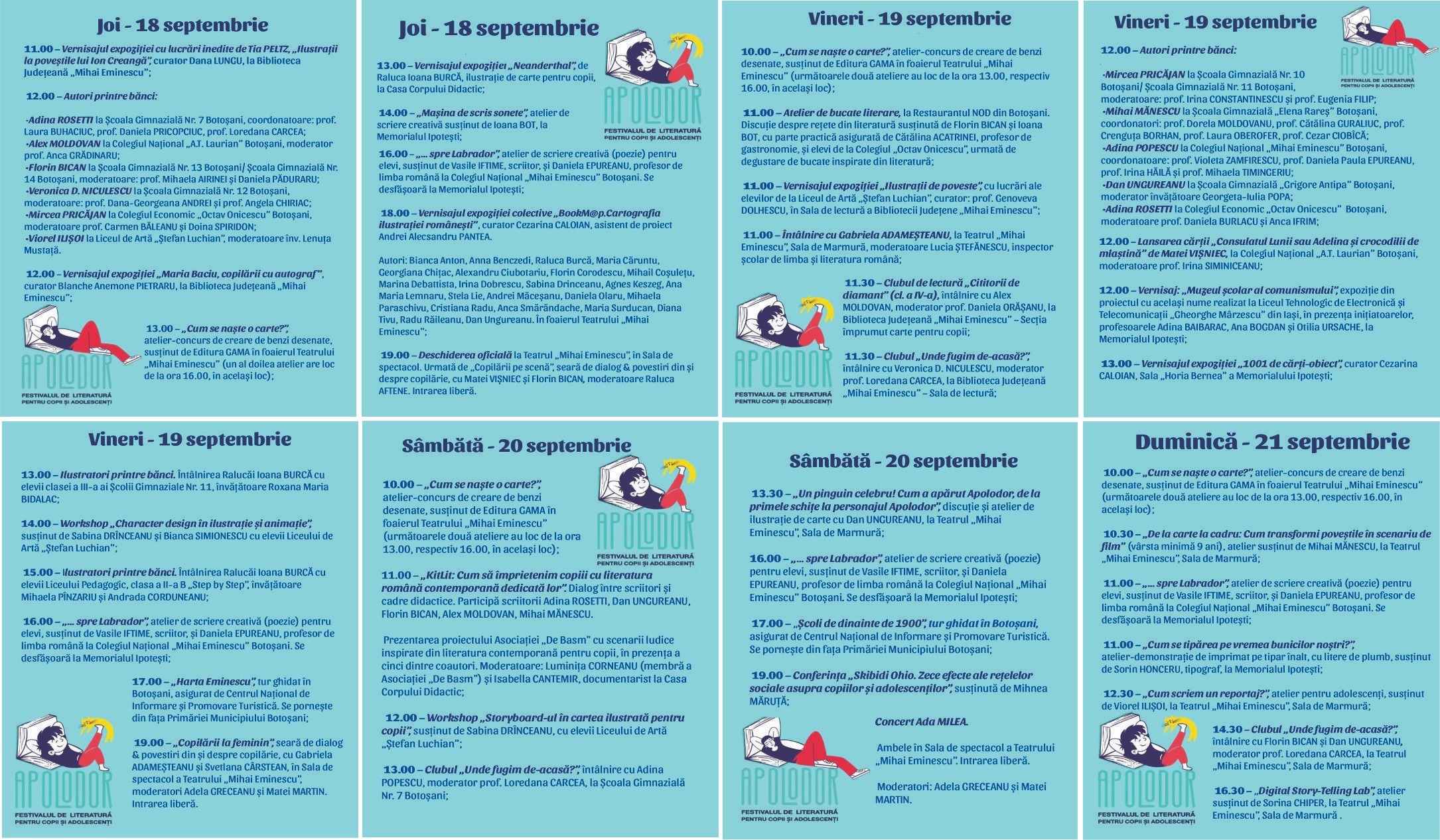 Scriitori și artiști vizuali consacrați în literatura contemporană pentru copii și adolescenți vor fi prezenți la Botoșani, unde se vor întâlni cu cititorii în școli, la bibliotecă sau în sălile de spectacol. Festivalul se desfășoară în 19 locații, printre care opt școli gimnaziale, cinci licee și colegii, Teatrul „Mihai Eminescu”, Memorialul Ipotești, Biblioteca Județeană „Mihai Eminescu”, Casa Corpului Didactic și Primăria Botoșani.