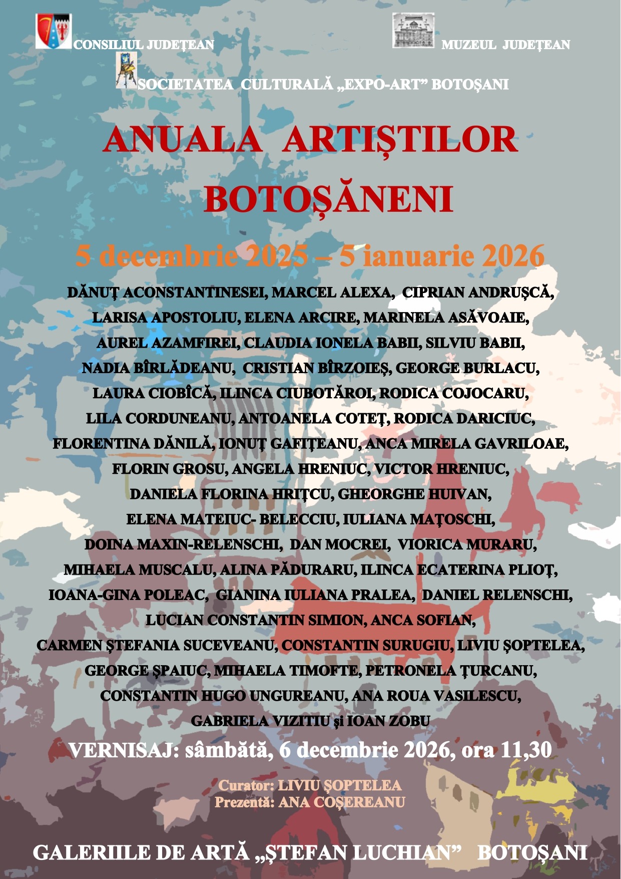 Muzeul Județean Botoșani găzduiește, în perioada 5 decembrie 2025 – 5 ianuarie 2026, „Anuala artiștilor botoșăneni”, una dintre cele mai importante expoziții colective dedicate creatorilor de artă din județ. Evenimentul este organizat de Societatea Culturală „Expo-Art” Botoșani și este curatoriat de artistul Liviu Șoptelea.