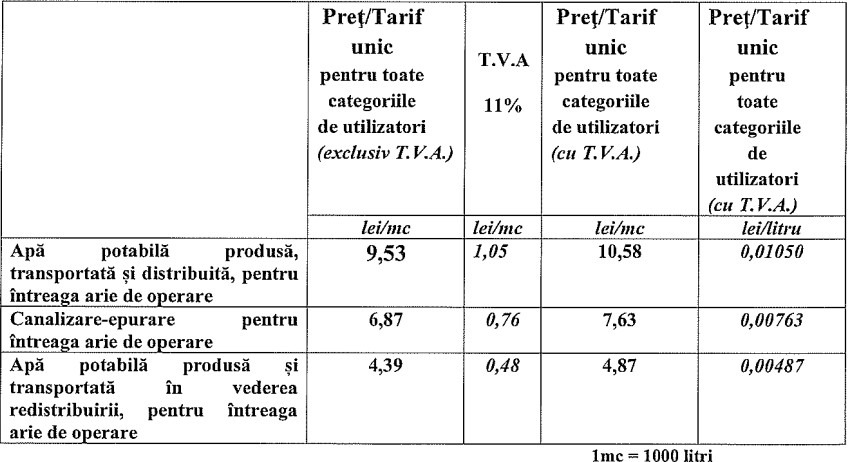 - prețul apei potabile produse și transportate pentru redistribuire va crește de la 3,89 lei/mc fără TVA la 4,39 lei/mc fără TVA, adică o majorare de 12,90%.