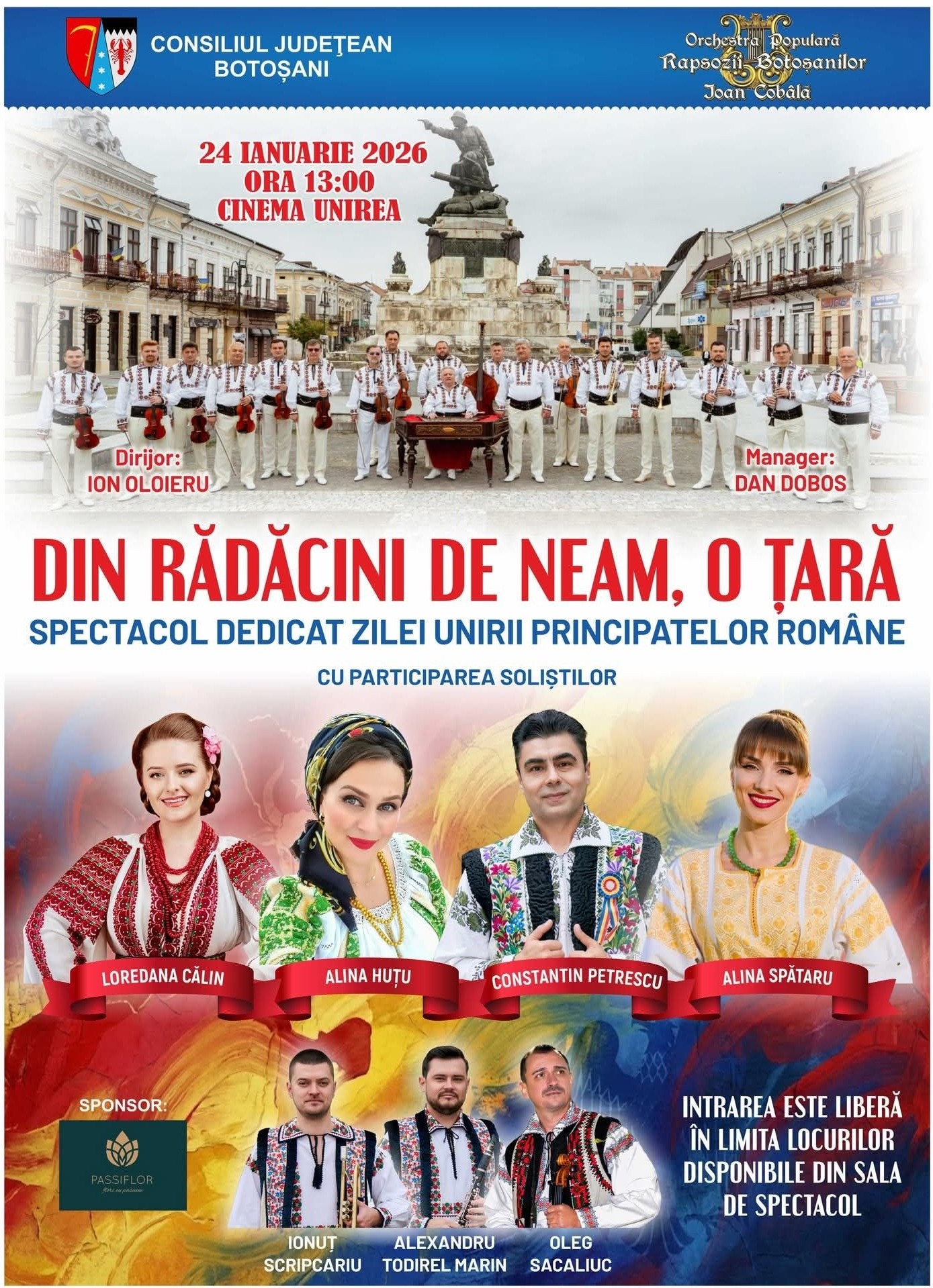 Orchestra Populară „Rapsozii Botoșanilor – Ioan Cobâlă” organizează un eveniment special dedicat Zilei Unirii Principatelor Române, marcând împlinirea a 167 de ani de la Unirea Principatelor. Spectacolul, intitulat „Din Rădăcini de Neam, o Țară”, va avea loc pe 24 ianuarie 2026, începând cu ora 13.00, în sala Cinematografului „Unirea” din municipiul Botoșani.