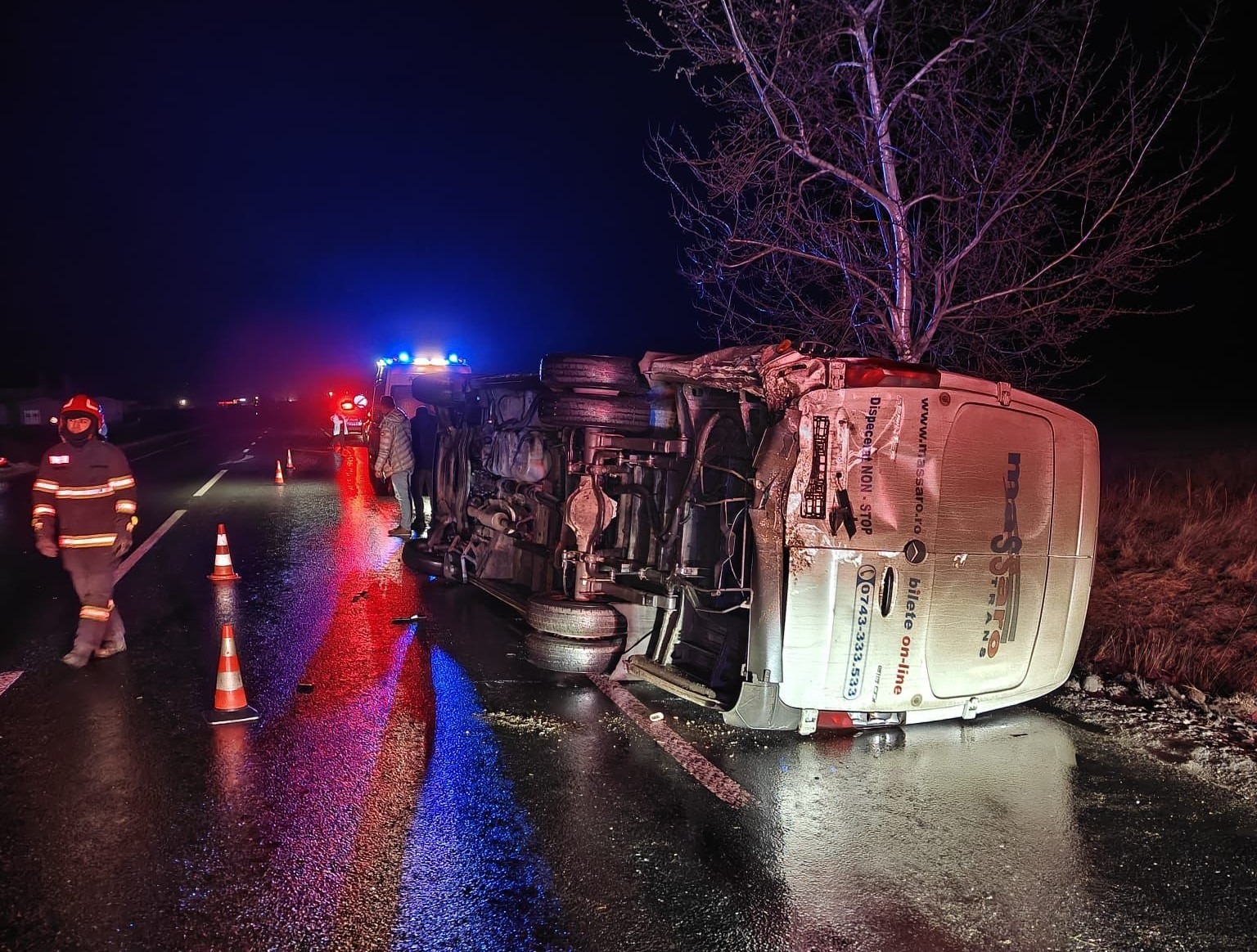 În urma impactului, microbuzul s-a răsturnat pe partea carosabilă, a pătruns pe sensul opus de mers și a lovit un autoturism condus de un bărbat de 47 de ani, din județul Botoșani. Autoturismul condus de tânărul de 26 de ani a părăsit, la rândul său, carosabilul și s-a răsturnat pe un teren viran.