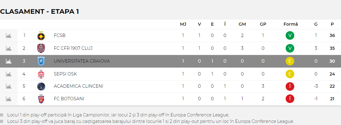 Etapa viitoare, FC Botoșani joacă acasă cu Universitatea Craiova, în timp ce Sepsi întâlnește CFR Cluj, iar Academica Clinceni primește vizita FCSB. Iată clasamentul: