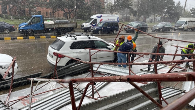 Schele de construcții prăbușite în Botoșani din cauza vântului puternic, două mașini avariate
