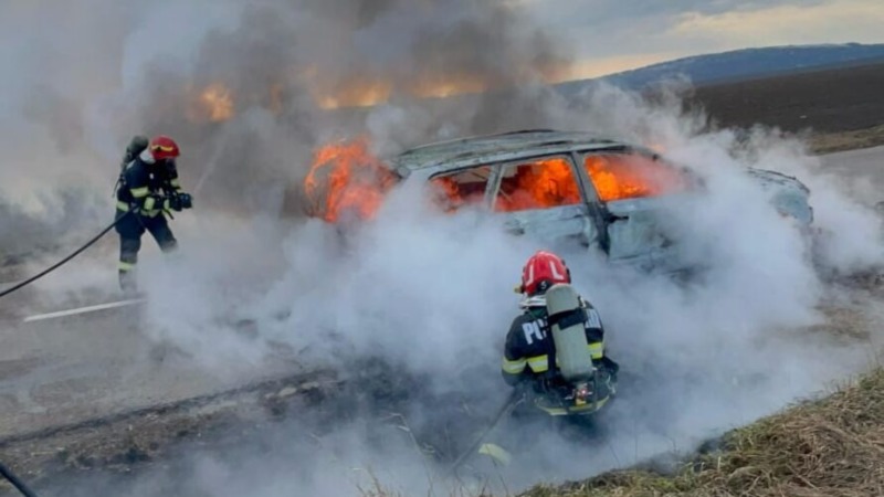 Mașină mistuită de flăcări pe un drum din Botoșani