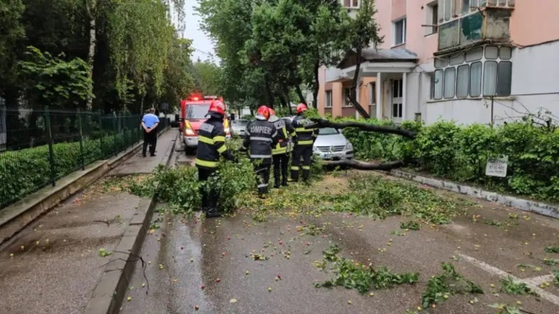 Circulația rutieră blocată de un copac doborât de vânt, pe o stradă din Botoșani. O femeie a sunat la 112