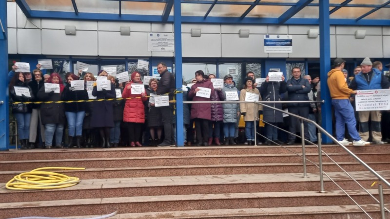 Angajații TESA de la Spitalul Județean ”Mavromati” Botoșani au întrerupt lucrul și au ieșit în fața unității pentru u...