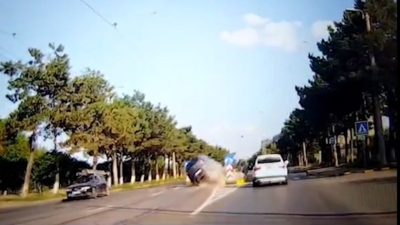 Cascadorie pe o stradă din Botoșani! O mașină se răstoarnă după ce lovește scuarul de tramvai