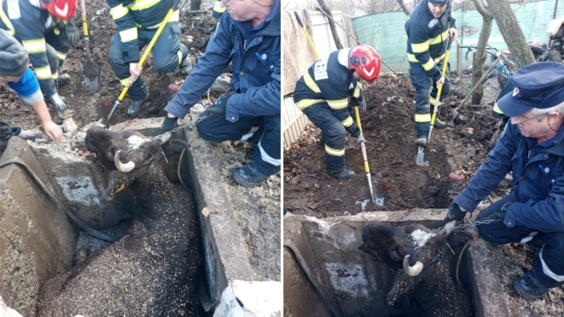 Operațiune contra cronometru în Ștefănești. Pompierii au salvat o vacă blocată într-un cămin de apă