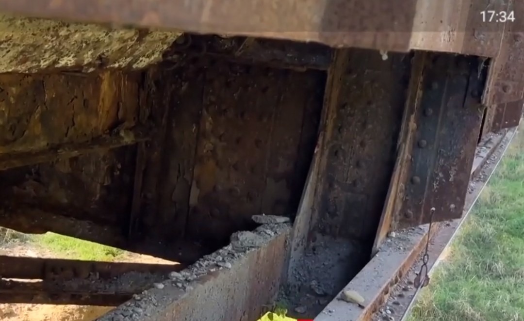 Angela Bertea, reporter Observator: Structura metalică a podului este atât de afectată încât la o simplă atingere sau vibraţie cad exfolieri din ea.