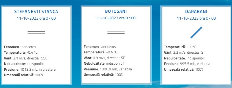 La ora 8.00, temperaturile au fost și mai scăzute. La Botoșani s-au înregistrat -14 grade, la Stânca -0,7, iar la Darabani -0,4 grade Celsius.