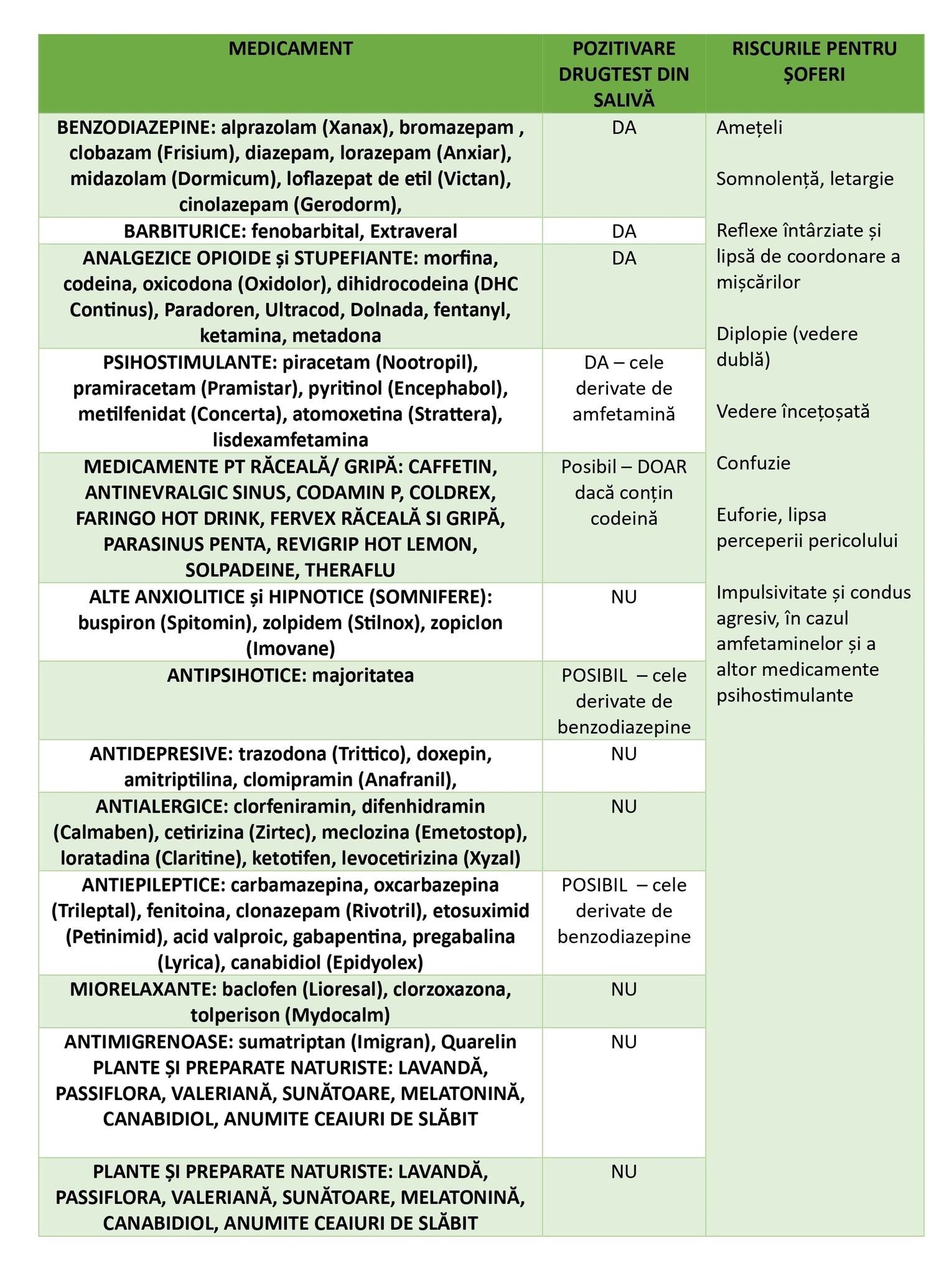 Iar șoferii care iau antivirale pot obține rezultate fals pozitive la cannabinoizi. Cei care consumă medicamente antiinflamatoare pot avea rezultate fals pozitive fie la cannabinoizi, fie la barbiturice.