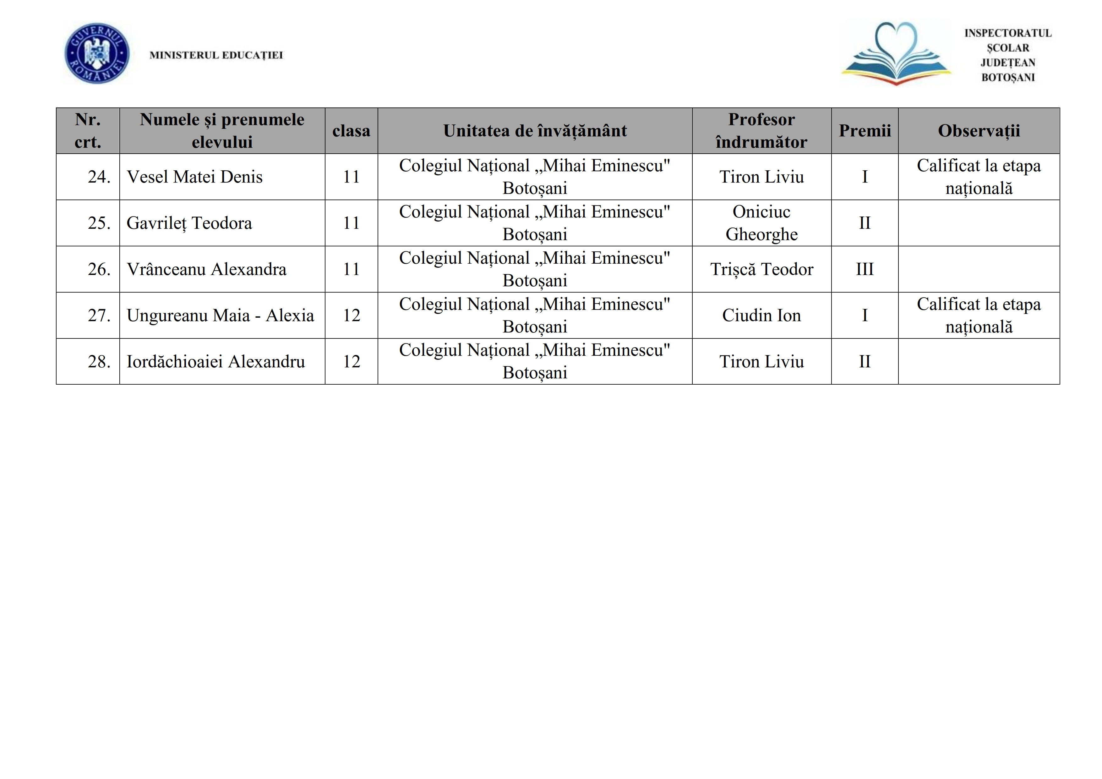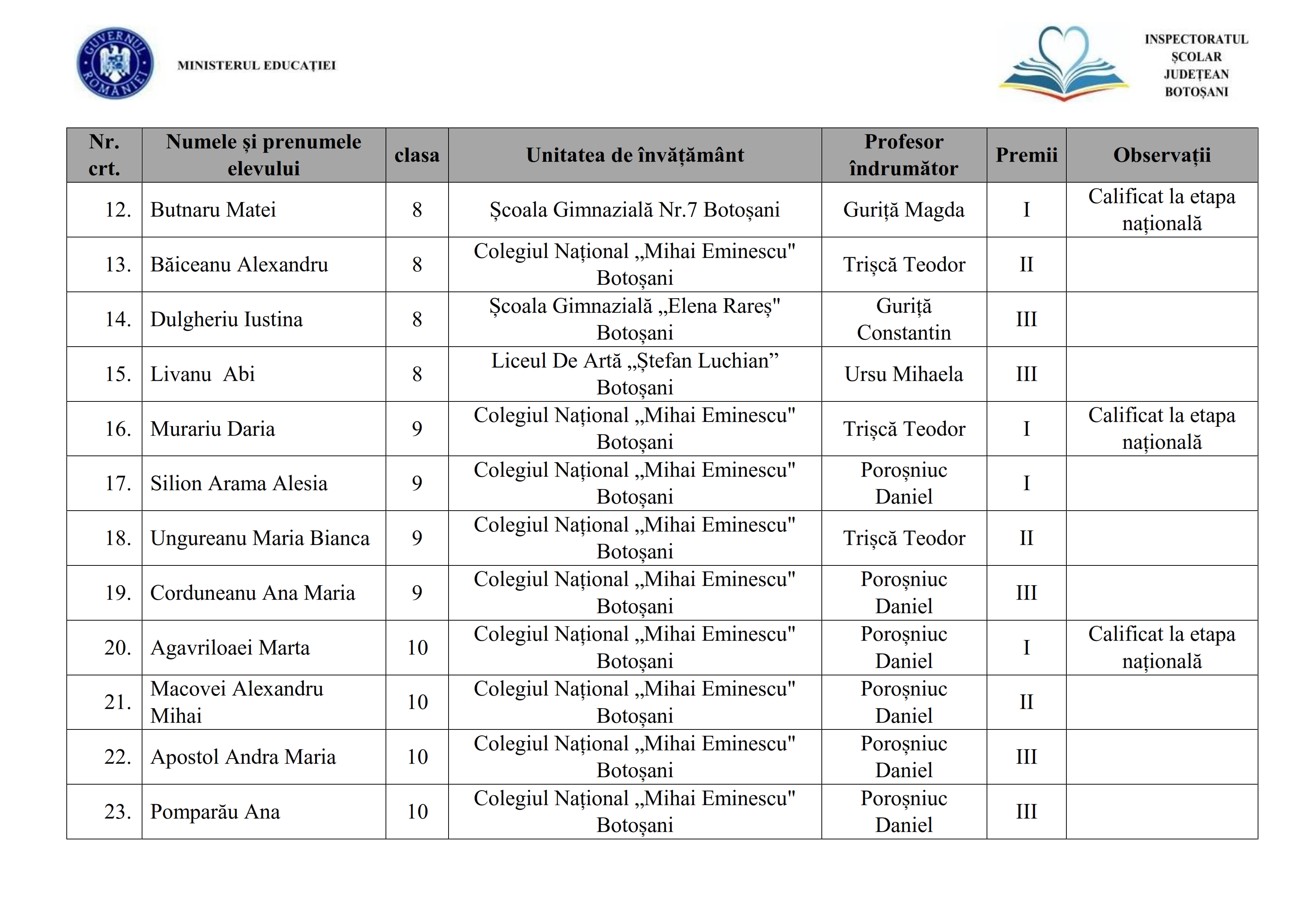 - Maia Alexia Ungureanu, din clasa a XII-a, de la Colegiul Național „Mihai Eminescu”, îndrumată de profesorul Ion Ciudin.