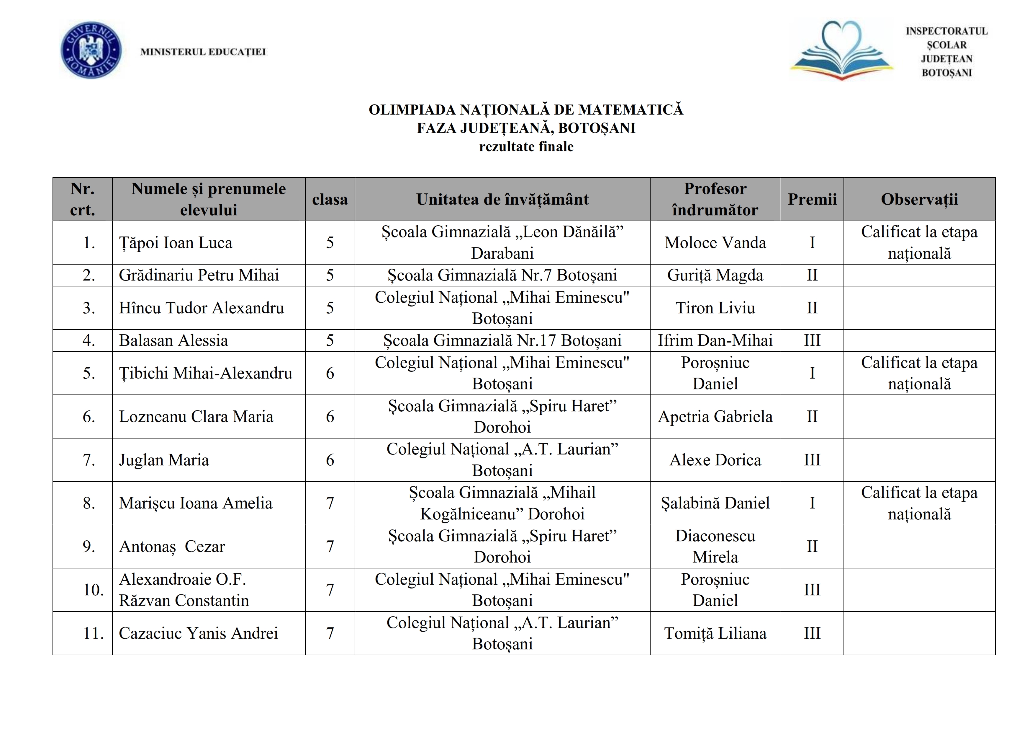 Un număr de opt elevi din județul Botoșani s-au calificat la Olimpiada Națională de Matematică. Aceștia sunt: