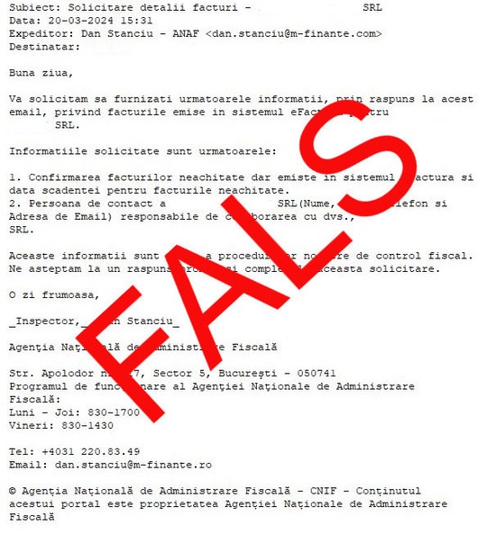”Reiterăm avertizarea privind campaniile de mesaje false transmise în numele ANAF, prin care contribuabililor le sunt solicitate informaţii privind facturile emise în sistemul e-Factura pentru societăţile pe care le administrează sau la care lucrează. Mesajele sunt transmise, de această dată, de la adresa de e-mail dan.stanciu@m-finante.com”, a transmis, miercuri, ANAF, într-un comunicat de presă.
