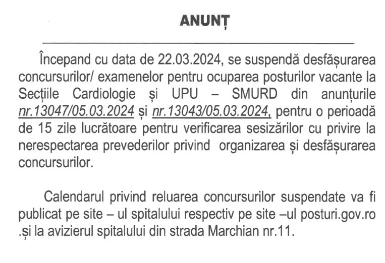 Pentru secția de Chirurgie, candidații au început examenul, dar în câteva minute li s-a comunicat că acesta a fost suspendat, a afirmat femeia. Conform deciziei conducerii Spitalului Județean Botoșani, concursul a fost suspendat pentru o perioadă de 15 zile.