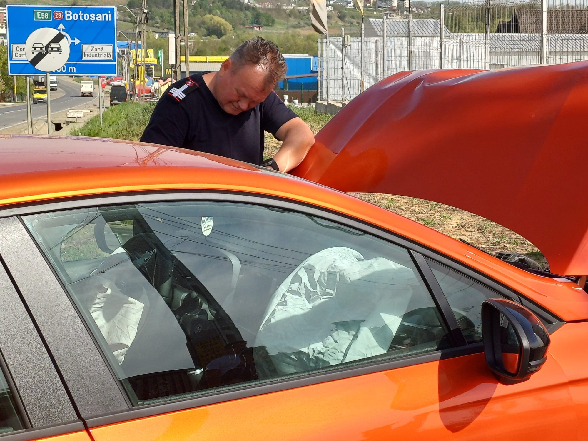 Este vorba despre un autoturism Renault Clio, care a intrat într-o autoutilitară din fața sa după ce șoferul acesteia a frânat brusc. Incidentul a avut loc în localitatea Hudum și nu s-a soldat cu victime, ci doar cu pagube materiale importante, în condițiile în care partea din față a Renault-ului a fost puternic afectată, iar ambele airbag-uri din față au sărit.