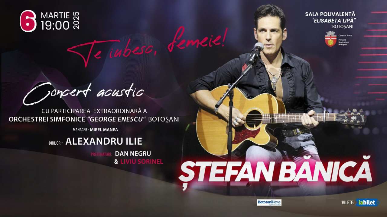 Unul dintre cele mai așteptate evenimente ale primăverii la Botoșani, concertul acustic Ștefan Bănică și Filarmonica Botoșani, va avea loc pe 6 martie, de la ora 19:00, la Sala Polivalentă „Elisabeta Lipă”. Spectacolul va fi prezentat de cunoscutul om de televiziune Dan Negru.