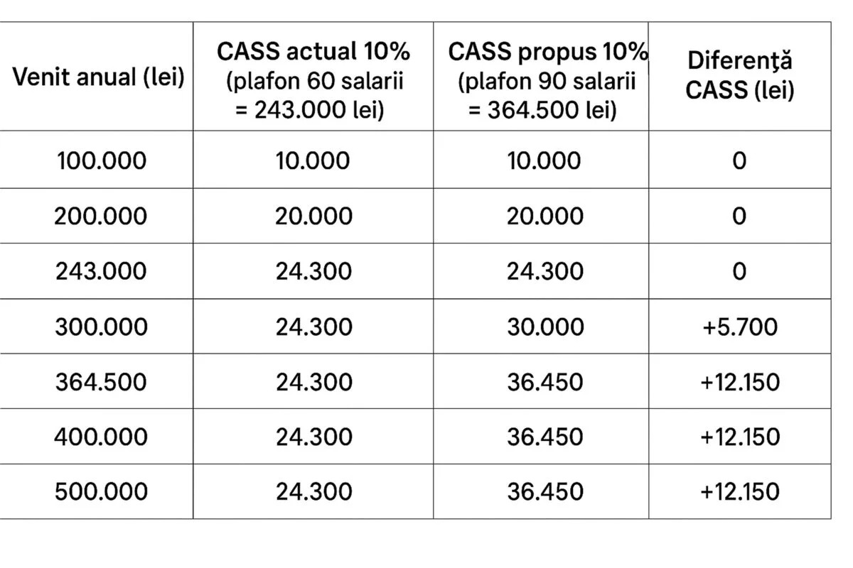 Conform calculelor, un venit anual de 300.000 lei ar aduce o creștere a CASS de 5.700 lei, iar la 400.000 lei sau mai mult, diferența ar fi de 12.150 lei față de sistemul actual.