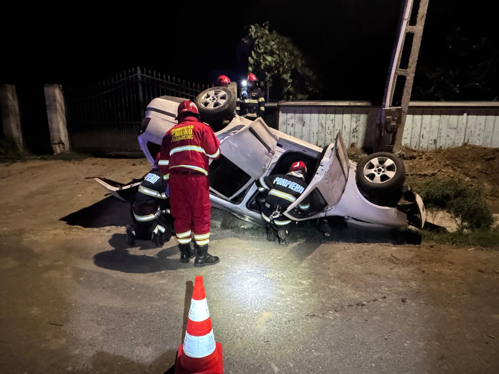 Echipajele au găsit autoturismul răsturnat pe capotă, într-un șanț de pe marginea drumului. Din fericire, nu au fost persoane rănite sau încarcerate.