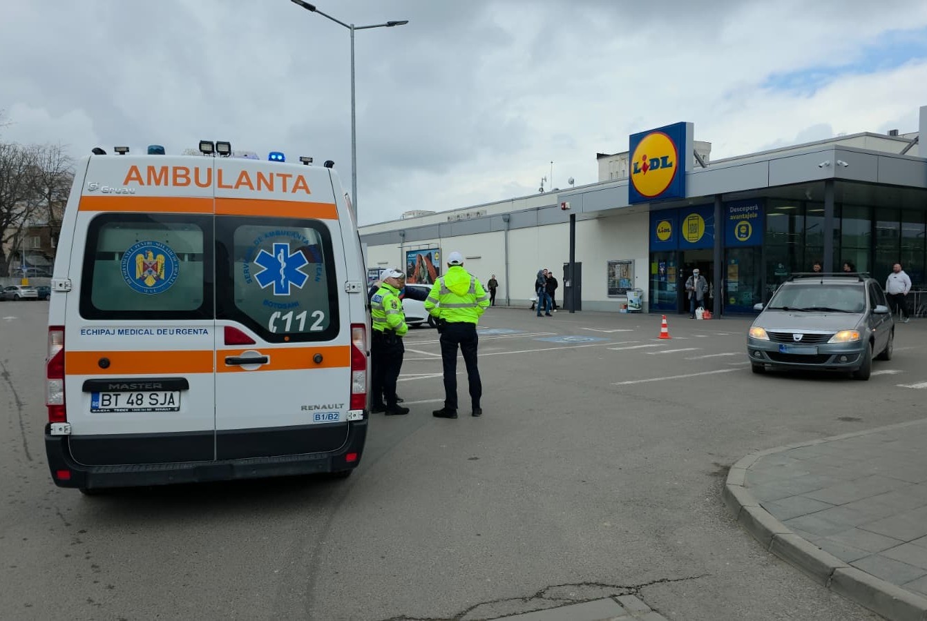 O femeie a fost rănită, în Vinerea Mare, după ce a fost lovită de un autoturism într-o parcare din municipiul Botoșani.