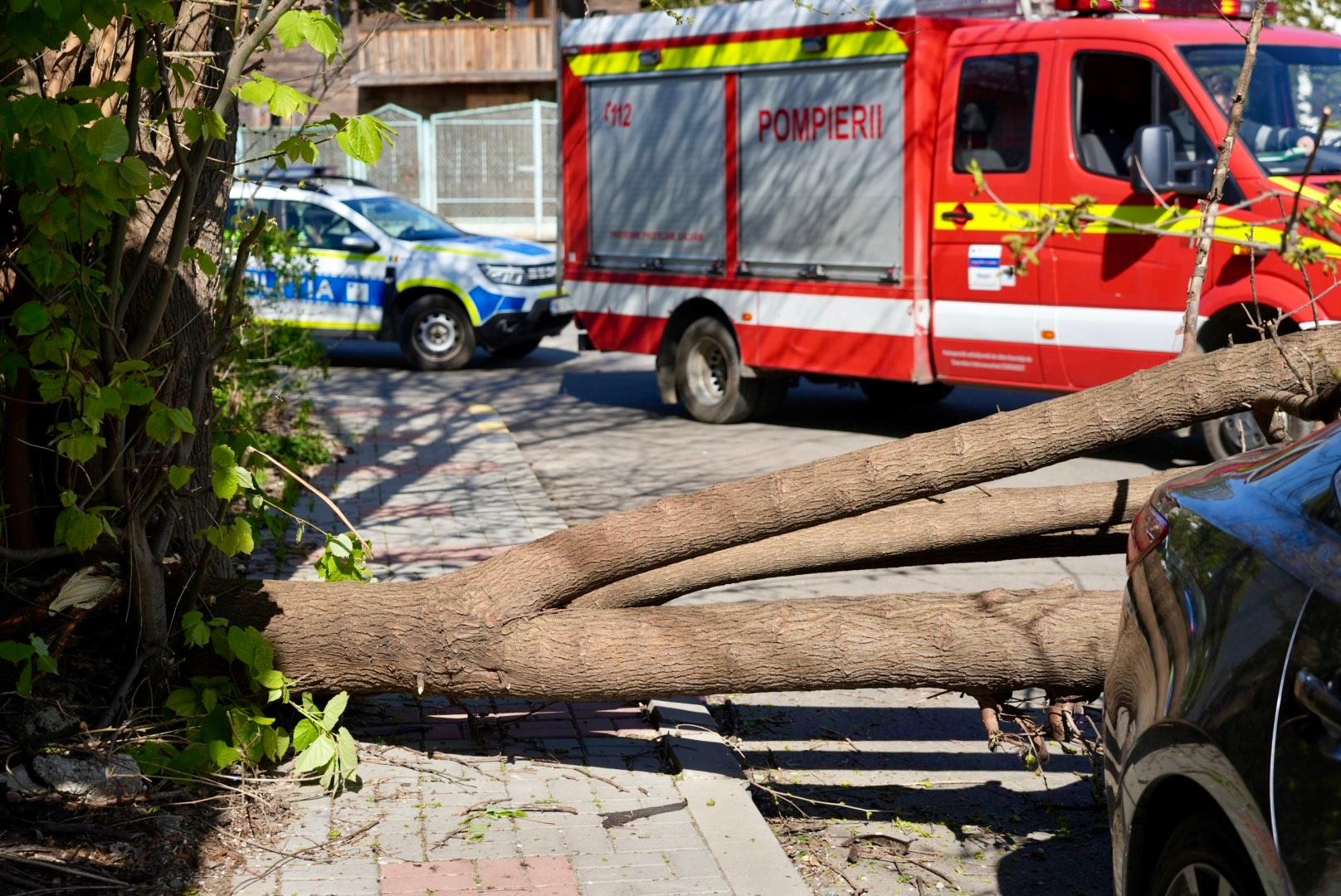 - copaci prăbușiți pe carosabil, trotuare sau peste autoturisme;