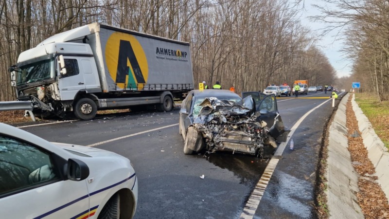 Un nou accident pe drumul european E 58. O maşină a intrat într-un camion. O persoană a ajuns la spital