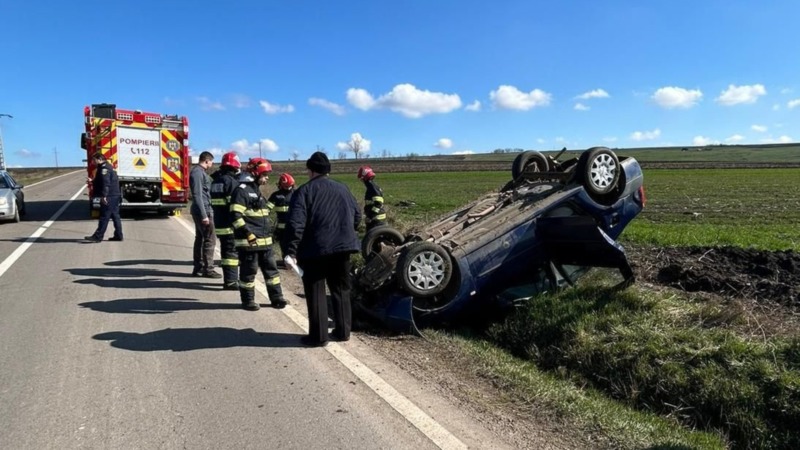 Accident! Maşină răsturnată pe cupolă după o depăşire. Patru persoane implicate în accident